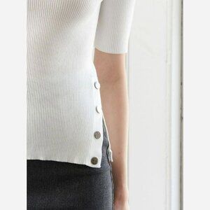 Make a statement in this timeless sweater with a modern twist. Designed with a round neckline and chic half sleeves, it features eye-catching side snap button detailing that sets it apart from the everyday knit. The body-contouring fit flatters your shape while maintaining a sophisticated and exclusive look.