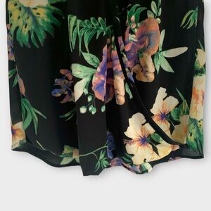 Tropical floral blouse in black with a vibrant multicolor printed pattern featuring hibiscus flowers and lush green leaves. Designed with a halter-style neckline, pleated drape front, keyhole back with button closure, bubble hem and flowy silhouette. Lightweight and unlined — ideal for summer or vacation wear.