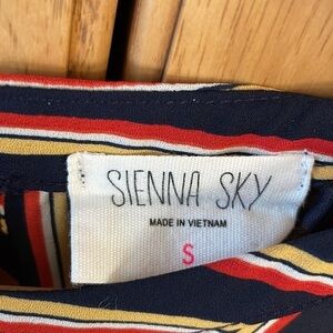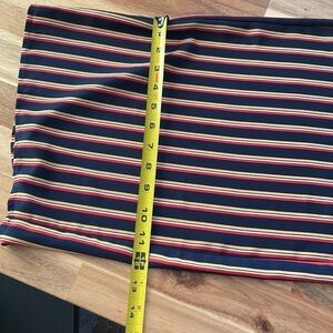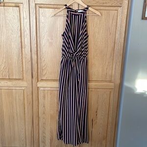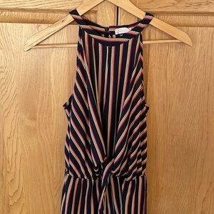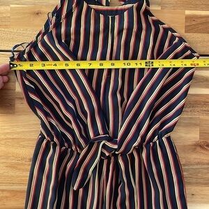 EUC striped blue, red, yellow and white jumpsuit with halter neck (button at back of neck) and decorative tie up at busy. Inseam 24”. Bottoms are lined. Perfect for the beach or a hot vacation this winter!