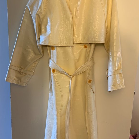 Exaggerated details define the Eva Trench. Cut in glossy poly embossed with alligator print, classic trench styling is updated with an oversized fit. Contrast topstitching defines features such as a storm flap, which is semi-detached and can be worn like a cape‚ grommeted belts at the waist, wrists and neck.