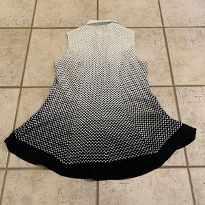 This stylish black and white sleeveless tunic top from Signature Collection is a versatile and chic addition to any wardrobe. The top features a fun polka dot pattern that transitions from small dots at the top to larger ones at the bottom, creating a dynamic visual effect. The flared, hi-low hem adds a modern and flattering silhouette.