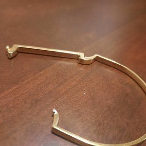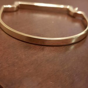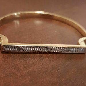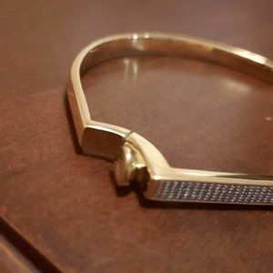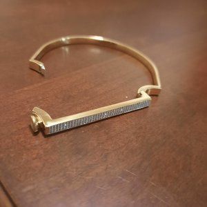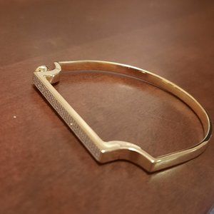 Designed with a dynamic mix of geometric lines and flowing curves, this glistening bangle features a flattened edge with pavé diamonds. The striking piece is fastened with a hardware-inspired hinge closure.