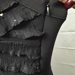 The top of the dress is adorned with delicate sequins and a ruffle detail adding a hint of sparkle and sophistication.