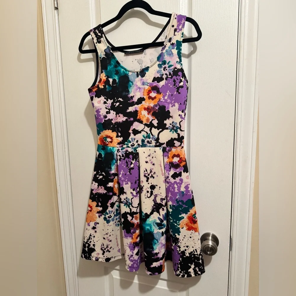 Never worn. Stylish dress with abstract patterns. Features teal, black, and white colors.