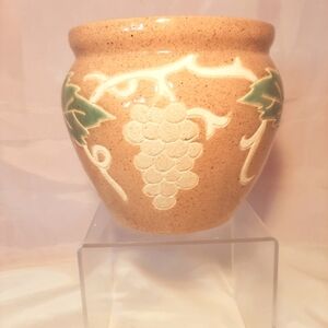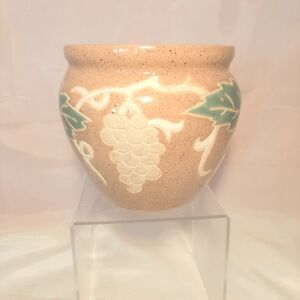 Signed Art Pottery Vase/Planter. Relief Textured Grapes/Leaves. Speckled Glaze