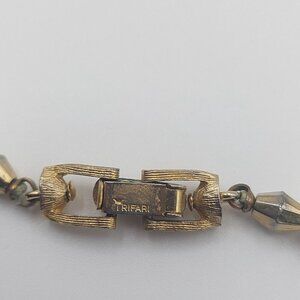 Beautiful Crown Trifari signed at the clasp Lariat necklace measuring 24 inches in total. Tassel is 3 inches and contains 9 strands of Milk Glass and gold/bronze color beads. The necklace is made of rectangular faceted milk glass beads with brass/gold beads in between. Beautiful. In good vintage condition with no missing beads and working clasp. some slight wear on the gold. Please see my other listings for more great vintage finds.