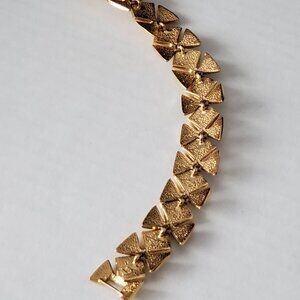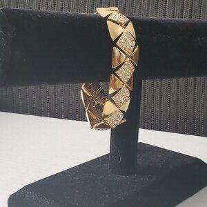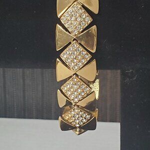 Signed Fifth Avenue Collection link bracelet. Named "Front and Center". This is a beautiful gold-tone bracelet featuring clear crystals set in a diamond shape between gold-tone bows, secured with a fold-over clasp. FAC is marked on the back of one of the links. Beautiful bridal or evening wear bracelet.