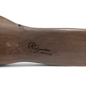 Add a touch of mid-century Mexican folk art to your collection with this charming signed Tonalá bird by R. Aguirre, crafted in the traditional style of Jalisco, Mexico. Made using the brunido (burnished clay) technique, the surface was hand-polished with a stone before firing, creating a smooth, glossy finish that highlights the intricate hand-painted details. This decorative bird features floral and feather motifs in earthy tones of black, gray, and orange against a cream body, balancing gracefully on two peg-style legs. Signed “R. Aguirre / Mexico” on the underside, it dates from the 1950s–1970s, representing the artistry and charm of mid-century Mexican ceramics.