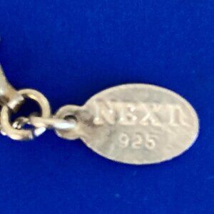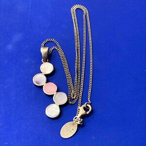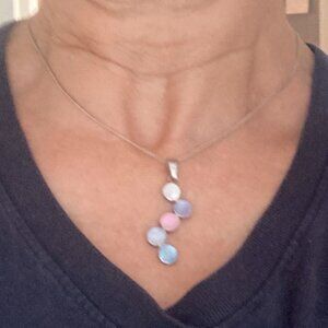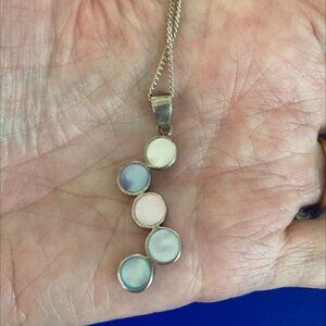 The pendant measures 1-1/4 inches and features five mother of pearl discs in different shades. Marked 925. The 15-inch chain has a hang tag marked NEXT 925. In lovely condition.