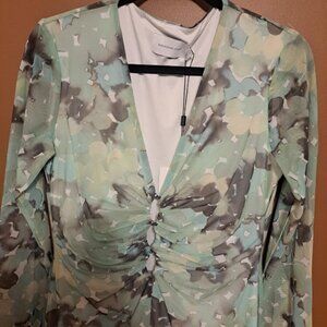 Dress is NWT and in perfect condition. It has a dramatic deep neckline with little metal clips on the lower bust, has long mesh sleeves, a center slit and lined throughout the bodice and skirt. Size US 12 and fits TTS.