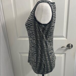Sigrid Olsen is a brand known for its focus on natural fabrics, textures, and patterns, often inspired by nature and global cultures. The tank top features a scoop neckline and a sleeveless design, making it suitable for warm weather or layering. The black and white pattern is intricate and eye-catching, giving the garment a unique and stylish look.