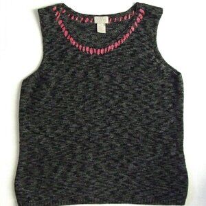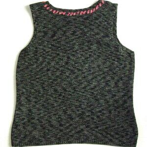 Grey and black pullover sleeveless sweater from Sigrid Olsen Sport. Pink leaf embroidery around the neck. Loose fitting. 48% rayon, 30% cotton, and 22% nylon. It is marked a size medium. There are not any stains, tears, or holes. Very good, gently used condition.