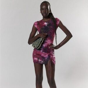 Stylish mini dress with a tie-dye pattern. Features a ruched side detail. Perfect for casual outings.