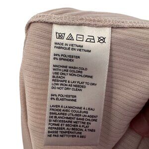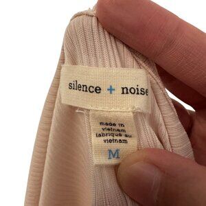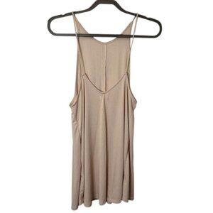 A "Silence + Noise" low-back dress in a neutral, beige color. It is a tank top style dress with thin straps and a scoop neckline in the front. Features a low-cut back design. The fabric is made of comfortable and stretchy material. The dress has a relaxed or fit, designed for comfort and ease of movement.
