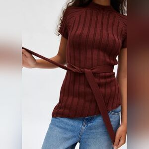 Silence + Noise sweater made modern in a slim, tunic silhouette. Designed in a textured, ribbed knit featuring a mock neck, short sleeves and a tie-waist detail for a tailored look