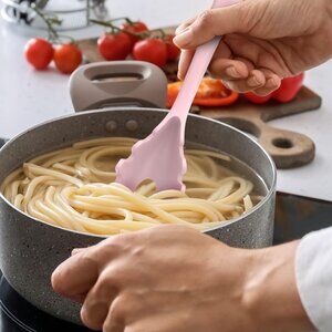 Nonstick Cookware Friendly: The thickened silicone head of this silicone kitchen utensils set is soft and elastic; ideal for silicone utensils for cooking with nonstick pans; makes close contact with the pan surface without scratching the nonstick coating; thus extending the pan's service life; the silicone handle with moderate size offers a comfortable grip and blocks heat transfer; making it easy to flip; strain dishes or serve soup