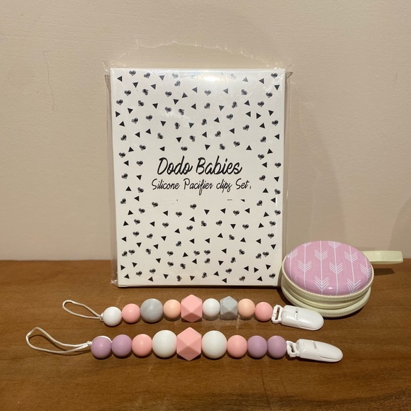 Dodo Babies Pacifier Clips and Case. They are new and unused. Each box comes with 2 clips and 1 case.