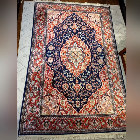 Beautiful hand made silk area rug from India. It measures 4x6 feet with tassels on the ends. Recently professionally cleaned.