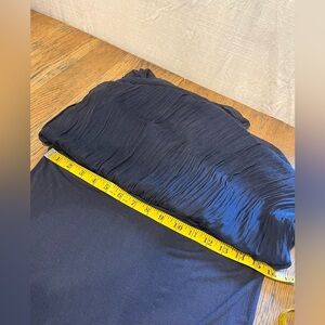 Elegant navy blue blouse with long sheer sleeves and a crinkled silk texture. Features a stunning crocheted neckline and a soft layered hem for a romantic silhouette. Body lined in a stretchy viscose blend for comfort. Made in Italy.