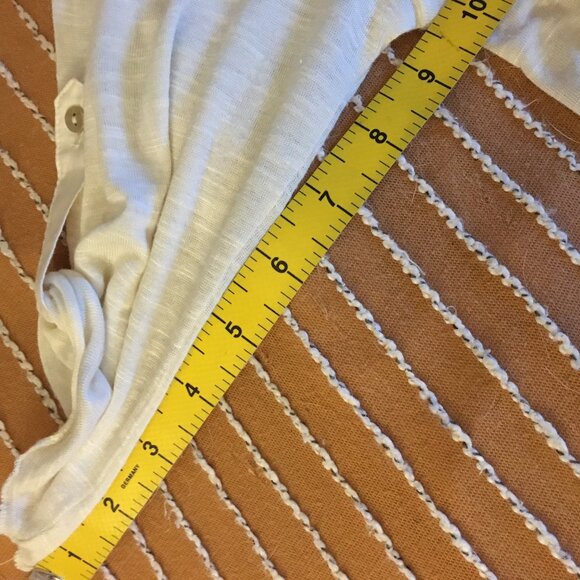 Very good preowned condition, off-white/cream silk/cotton blend, slinky button down shirt with beautiful brown/gold/silver embroidery by Como No?. This is a really lovely shirt. It hangs beautifully on the body. Very flattering for longer torsos too. Awesome embroidery work and delicate 'mother of pearl' like buttons.