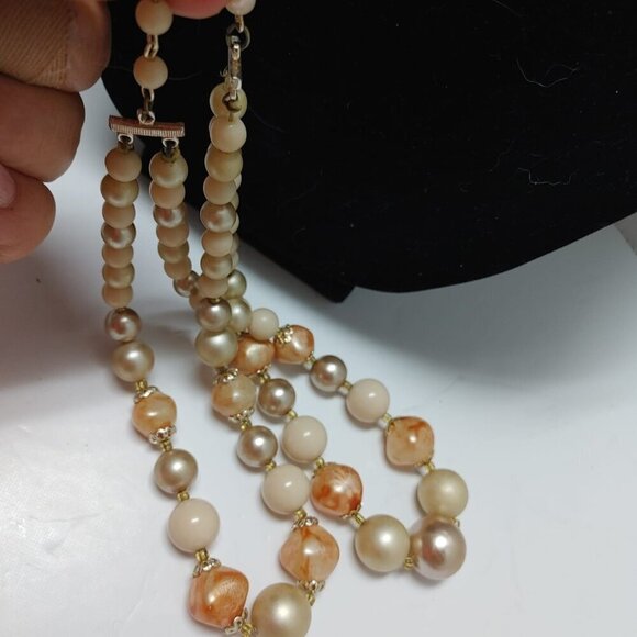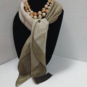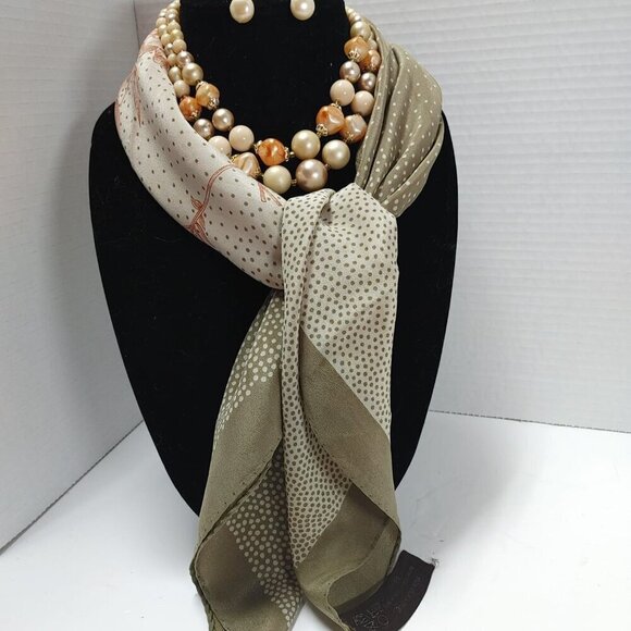 The scarf is accompanied by a double-strand necklace and a pair of faux pearl earrings, both crafted from high-quality metal with an art deco look. The set is perfect for those who appreciate vintage style, and its brand, decade, color, and country/region of manufacture details add to its unique charm.