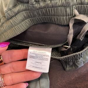 Army green joggers in a beautiful, thick washable silk with a slight sheen. Elastic waist measures 13”, rise 11.5”, inseam 27”. In excellent condition.