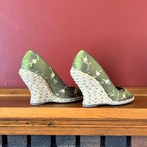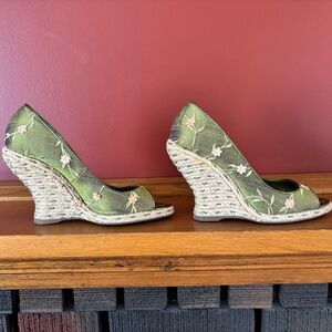 Green silk espadrilles with peach-coloured flowers, size 6 (fits narrow at toes), wedge heel measures 4". Slight discolouration on heel and on instep (see photos), imperfections reflected in the asking process. These pretty shoes were a little too tight for me, so only worn a few times. They look gorgeous on and really elongate the leg.
