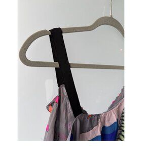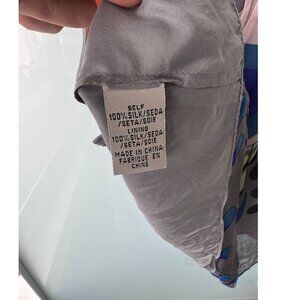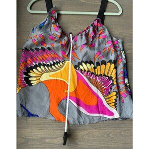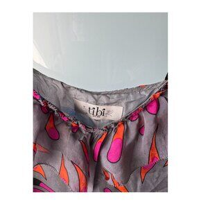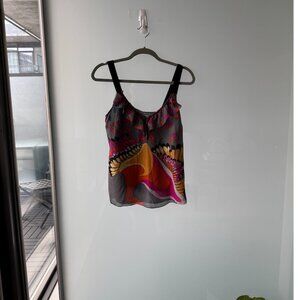 Silk tank top / sleeveless shell from Tibi in beautiful colourful crane print; pink and orange on front, blue and green on back. V-neck ruffle front w grosgrain straps; fully lined in silk. Good used condition.