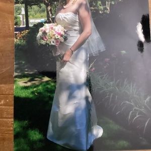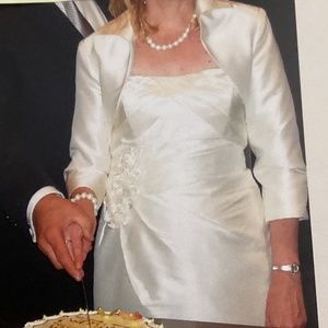 Silk Wedding Dress, this dress has been worn but I think someone else can definitely wear it again. I liked this dress because it had the matching jacket. There are some faint stains around the bottom of the dress, the last pic is a stain on the lining close to the bottom of the dress. All of these stains will not be visible when wearing. I had the dress cleaned after I worn it but it would need a good steaming. The dress is a size 8 but it was taken in to fit me. At the time I worn this dress my measurements were B 34”, W 28”. My height is about 5’ 3”. The dress measurements are: