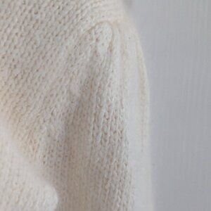 58% silk, 30% nylon, 10% angora, and 2% lamb wool. Size small. Pit: 45 cm. Sleeve length: 59 cm. Total length of the sweater: 56.5 cm. Shoulder pads. Pleats at the shoulders. Soft, lightweight. No stains or tears. Like new! Cream color with with details in gold, red, and purple.