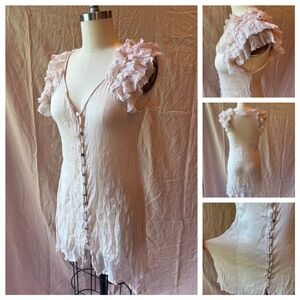 Features dramatic ruffles on the shoulders and mother of pearl buttons. Stretchy fabric. Tag shows UK2 which is US4. The size is flexible due to stretchy fabric,
