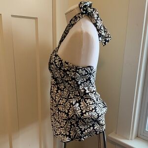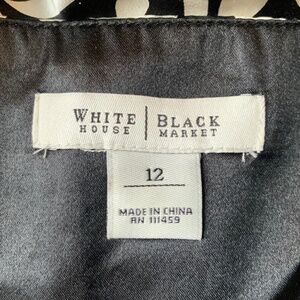 Elegant silk top, white floral pattern on black background, zipper on the side. Bust lining made of polyester. Size 12. White House Black Market.