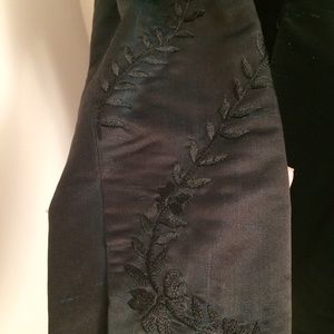 Dark teal silk suit (matching pants available for sale) with small hook buttons and embroidered detailing on the sleeve. The suit comes down to just below the knees (trench coat style)