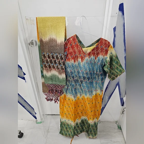 multi colored silk dress with gold thread weave with pants and duppatta