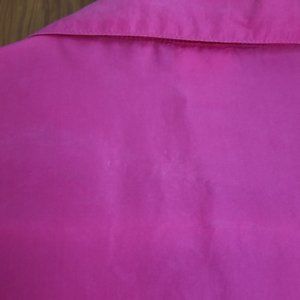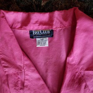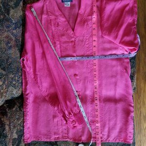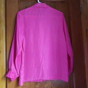 Vintage 80s, soft silk, attractive open neck with front pleats, dressy. Wear tucked in or out. Made by Bay Club, (The Bay) size women's S, M, size 10 petite. Width pit to pit, 20 inches, length 25.5 inches, colour bright medium pink, rose pink.