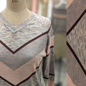 Love me a good chevron, colorway of peachy taupe brindled with a smoky grey, espresso stripe.