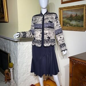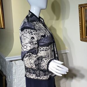 In good preowned condition lovely pure silk jacket from Silkland. Features a beautiful pattern that includes flowers and abstract shapes. In elegant black, grey and ivory tones. Frill along edges, unbuttoned style, fully lined.