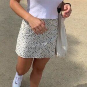 Cutest little summer skirt. The material feels satin-y and the lining is soft. It's high waisted and perfect length. I am 5"3 for reference. The waist is elastic so can be stretched to sit anywhere on your waist. Perfect condition!