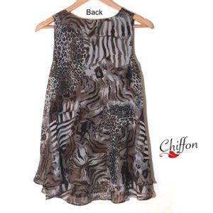 Silky Soft Chiffon Tunic Top Round Neck Brown Black Animal Print Sleeveless, M