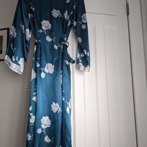 Long satin bathrobe, peacock blue with floral decoration. Good condition, no tears or stains. Belt with loops and inner tie closure.