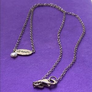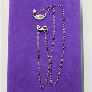 Elegant silver necklace featuring a 'Dream' pendant. Perfect for adding a touch of inspiration to any outfit.