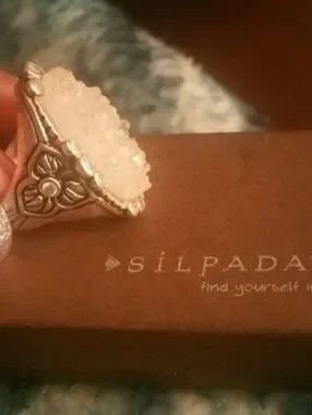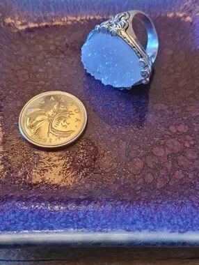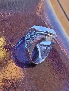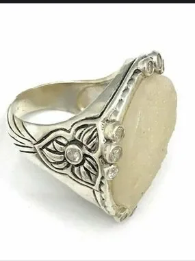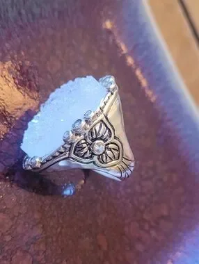 GORGEOUS. Like-new. Sterling silver with cubic zirconia and large white druzy stone. Intricate floral filigree band. Shiny silver finish. Eye-catching centerpiece for any outfit. So stunning. So unique!