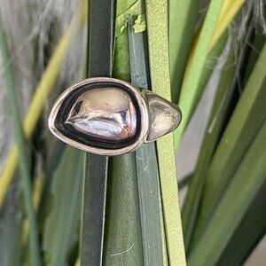 Teardrop shape design with an Asymmetric surface and oxidized details, a modern geometric and handcrafted look. Ring is made of high-quality sterling silver. Will come in Michael Hill dustbag & box as pictured. Ring is used in great condition.