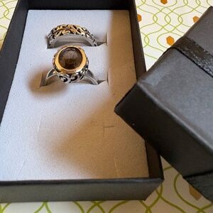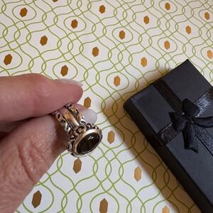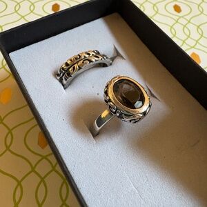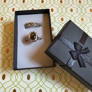 Features an oval set smoky quartz band, and two 925 sterling silver filigree bands, making up Set of 3 stackable ring set.