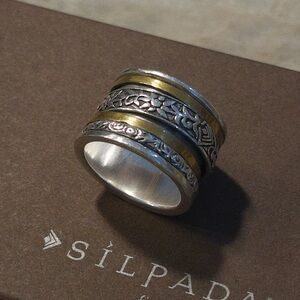 This elegant two-tone spinner ring features a beautiful combination of sterling silver and bras. Perfect for adding a touch of sophistication to any outfit.