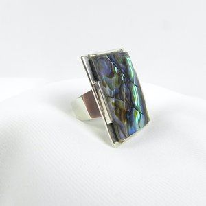 Incredible large rectangular abalone shell ring set in 925 silver. It is in wonderful condition and the abalone shells shine an iridescent blue and green with tiny hints of brown and purple.