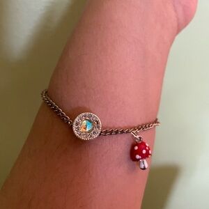 Charming silver bracelet and earring set with mushroom charms. Features a red mushroom charm on the bracelet. Earrings are unbranded.