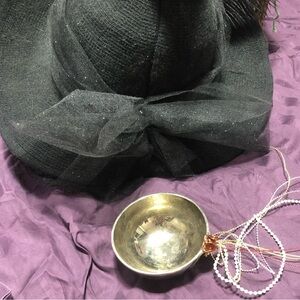 Small Silver coloured bowl featuring a bold pentagram design. Accented with decorative beads and wire, this vintage bowl is decorated for a Wicca ritual although can be used as a holder for crystals, herbs, or small amulets . This bowl was up-cycled and decorated by myself .