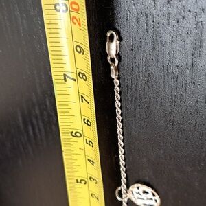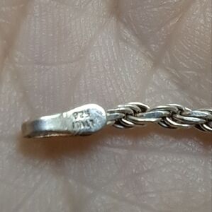 The bracelet is stamped 925 Italy, tests positive for silver and is non magnetic. The lobster clasp is steel. The charm says ster and tests positive for silver but is also slightly magnetic, indicating that it is silver plated. Good used condition with some scratches that can be seen under magnifier.