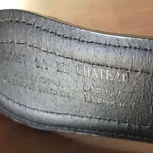 Black pebbled leather belt with bold silver buckle and elastic back. Label missing, but feels like genuine leather on the outside. Measures approximately just under 1.75" wide at the back to just over 2.5" wide at the front, 27.5" in total length and 14" long when buckled. Little wear on the buckle where a copper colour is showing in 2 small spots (see last 2 photos). Condition: Excellent!